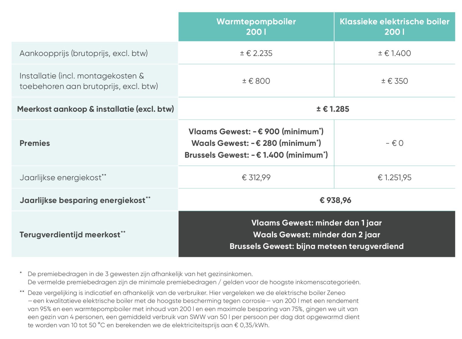 Een kwalitatieve elektrische boiler met een capaciteit van 200 l kost in aankoop ± € 1.400 (excl. btw) en de installatiekost ervan bedraagt ± € 350 (excl. btw). Een warmtepompboiler met een capaciteit van 200 l kost in aankoop ± € 2.235 (excl. btw) en de installatiekost ervan bedraagt ± € 800 (excl. btw). Het verschil in investering bedraagt dus ± € 1.285 (excl. btw). Deze meerprijs verdien je snel terug. Want niet alleen bespaar je voortaan vanaf het eerste jaar ca € 940/jaar op je energiefactuur, je geniet ook nog eens van premies in de 3 gewesten, waardoor je de meerprijs in investering in het Brussels gewest bijna meteen terugverdient en in het Vlaams Gewest in minder dan 1 jaar en in het Waals Gewest in minder dan 2 jaar.
